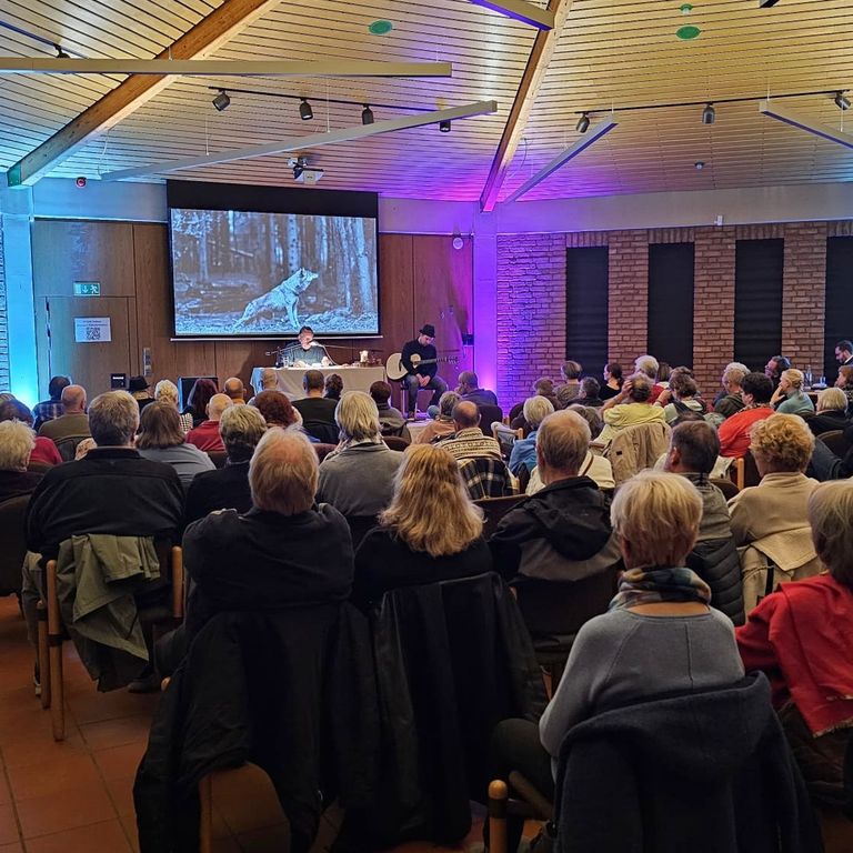 Passend zur dunklen Jahreszeit lud das Forum Hünxe e.V. am Sonntag zu einer Veranstaltung der besonderen Art ins Hünxer Rathaus ein. Unter dem Titel „Hünxer Sagenwelt“ wurden düstere Erzählungen vergangener Zeiten zum Besten gegeben. Mit kraftvoller Stimme präsentierte der Voerder Rezitator Werner Seuken Sagen und Geschichten vom Teufel, von Geistern, Wölfen und anderen Furchterregern. Stimmungsvolle Gitarrenklänge des Dinslakener Musikers Cesare Siglarski schufen den musikalischen Rahmen und ästhetische Schwarz-Weiß-Bilder des Hünxer Fotografen Stefan Weber untermalten den Vortrag im voll besetzten Ratssaal.